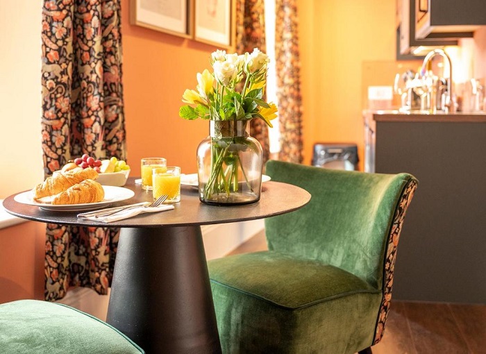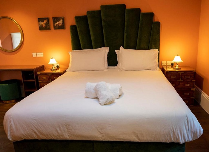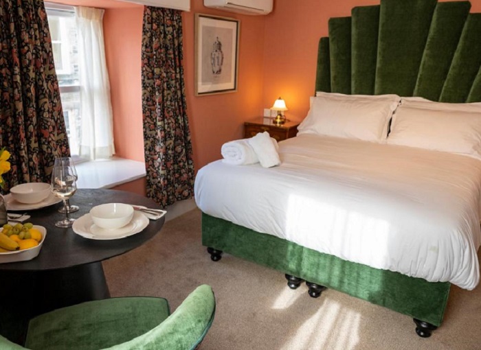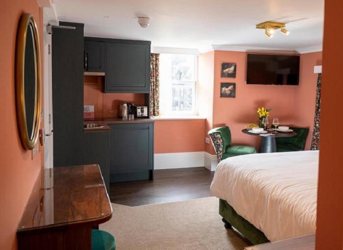 Dog friendly super king studio on the ground floor. Room is suitable for those with reduced mobility. This room is on the ground floor and therefore at street level adjacent to the restaurant and bar terrace. Please note there is an extra £40 per stay charge for dogs.